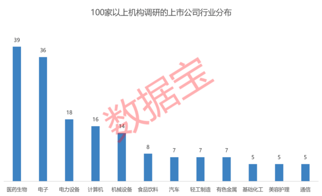 据证券时报·数据宝统计,二季度至今,获得机构集中调研(100家以上)的上市公司共计193家。按照申万行业分类,这些公司主要分布在医药生物、电子、电力设备、计算机、机械设备等行业,分别有39家、36家、18家、16家、14家,合计占比超过63%。