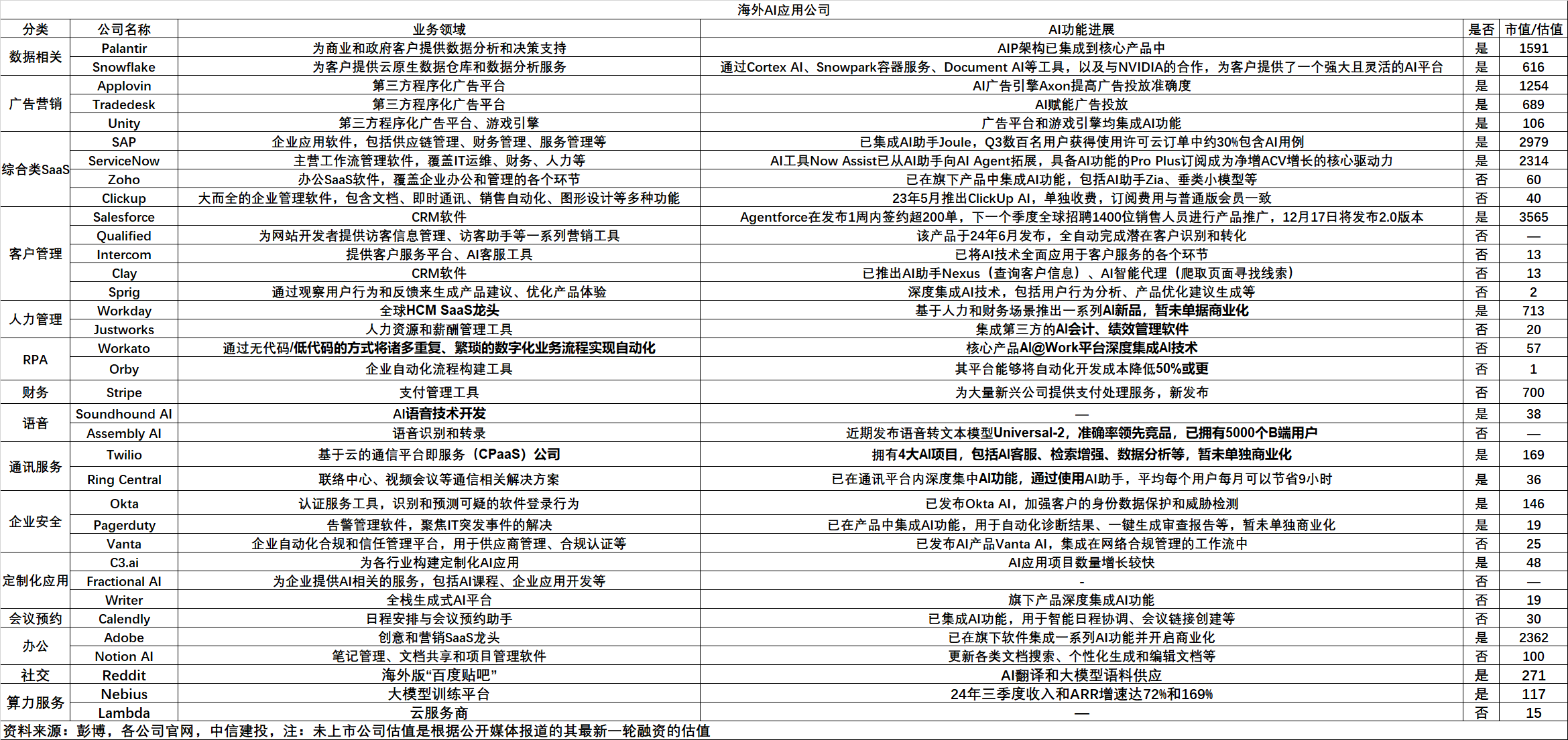 海外AI应用:AI渗透率明显提升、三季度业绩支撑。11月以来,海外AI应用的关注度得到大幅提升,起因是11月9日美国CRM公司Salesforce宣布将招聘1000名销售人员推广其AI助手产品Agentforce,并且很多客户对Agentforce的使用反馈佳。此后美股进入财报季,一批AI应用公司第三季度财报超预期,包括AI广告的Applovin,AI数据的Palantir和Snowflake,AI电商的Shopify,以及Salesforce自身财报的超预期,闭环验证了AI助手的可行性。