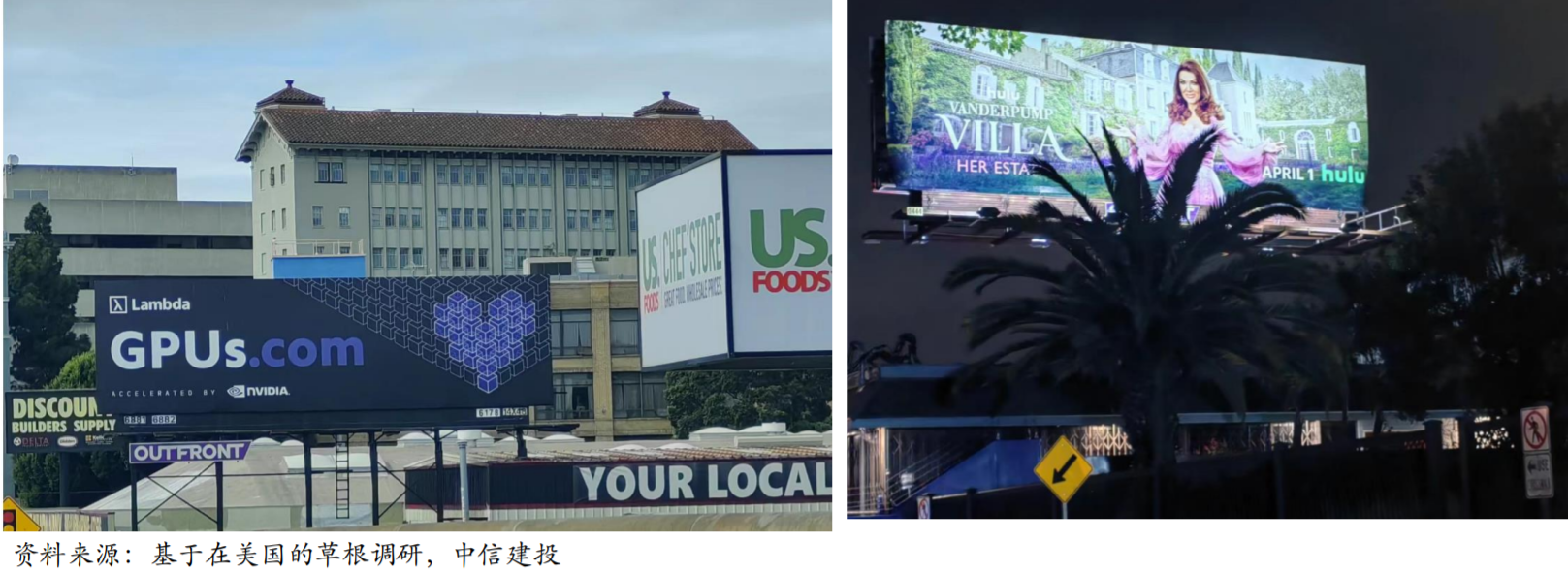 在美国旧金山、圣何塞、101高速公路等地有大量企业级服务及AI服务的户外广告牌。与之相对应的是洛杉矶地区户外广告内容则主要是Disney+、Netflix等视频平台新的剧集或电影上线。