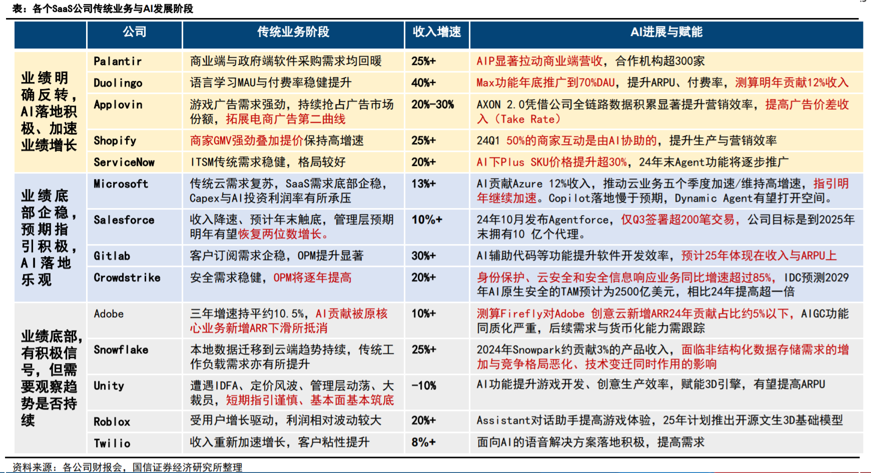 AI技术的应用激发了SaaS企业的新一轮产品创新周期,部分企业已推出AI产品,并在经历一年半的产品迭代后,2024年初部分SaaS企业的收入增速开始走出三年底部。AI技术不仅重新吸引了企业对IT的投入,还有助于加速软件功能开发、扩大客户采购项目单价、提升ARPU。具体案例包括Palantir和Duolingo,它们的业绩因AI技术的应用而显著增长。