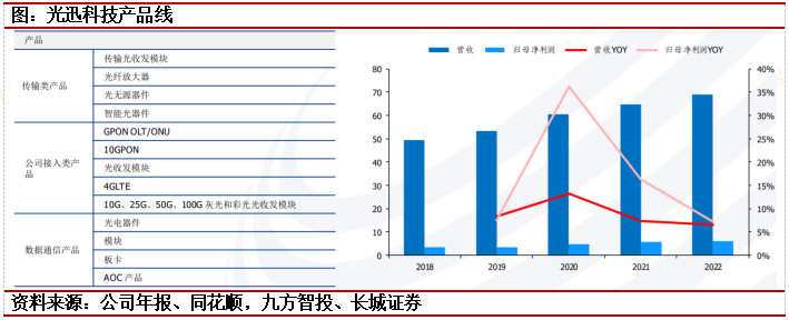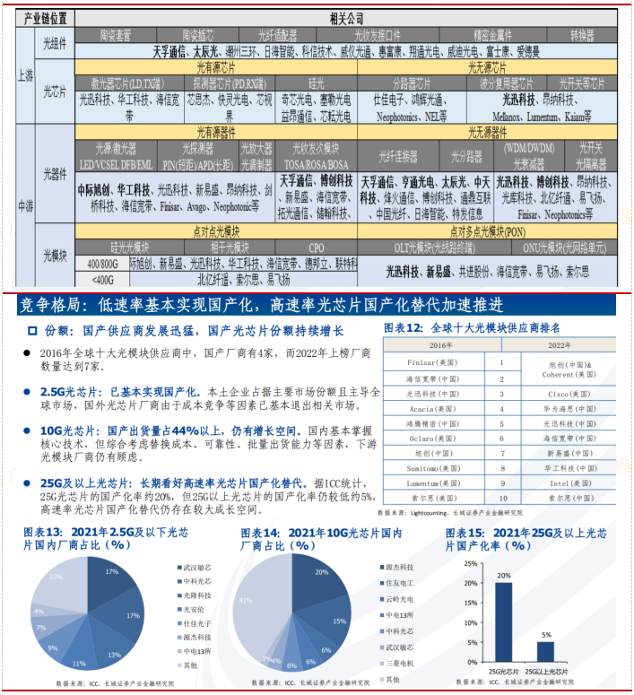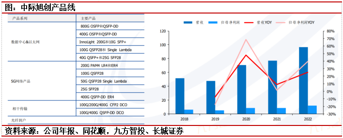 中际旭创:为云数据中心客户提供100G、200G、400G和800G等高速光模块,为电信设备商客户提供5G前传、中传和回传光模块以及应用于骨干网和核心网传输光模块等高端整体解决方案。据Lightcounting发布的2022年光模块厂商排名显示,旭创科技与Coherent并列全球第一。