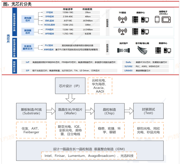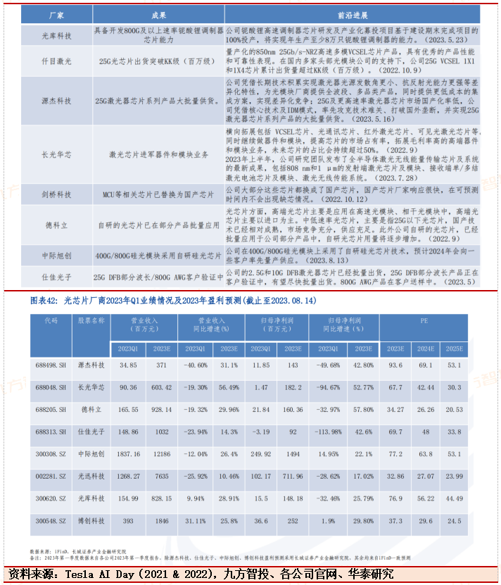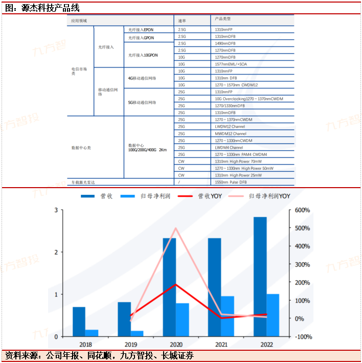 源杰科技:产品主要应用于电信市场、数据中心市场、车载激光雷达市场等领域,已实现向海信宽带、中际旭创、博创科技、铭普光磁等国际前十大及国内主流光模块厂商批量供货。1H23业绩短期承压,期待受益于高端光芯片国产化机遇。1H23业绩下滑主因光纤接入、数据中心等市场的光芯片需求不佳,下游客户减少采购及部分产品市场竞争。2H2310G1577nmEML或受益于接入网起量,24年100GEML或受益于高端光芯片供给缺口。