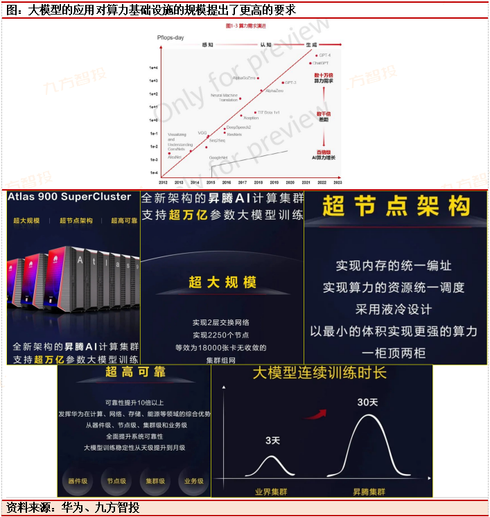 1)大模型的应用对算力基础设施的规模提出了更高的要求,算力基础设施急需迭代升级。根据华为发布的《加速行业智能化》白皮书,万亿参数一般需要万卡规模,算力不足意味着无法处理庞大的模型和数据量,也无法有效支撑高质量的大模型技术创新,未来AI算力将呈现总部-区域-边缘-终端四层架构,企业对基础设施的需求呈算力集群化、算力系列化等特征,模型参数越大,越需要单一物理空间的大规模训练集群;