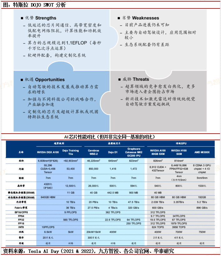 1)Dojo训练效率高于DGXA100,25个D1芯片组成的tile推理速度是24块A100的30x;FSD训练时间可从一个月缩短到一周以内;
