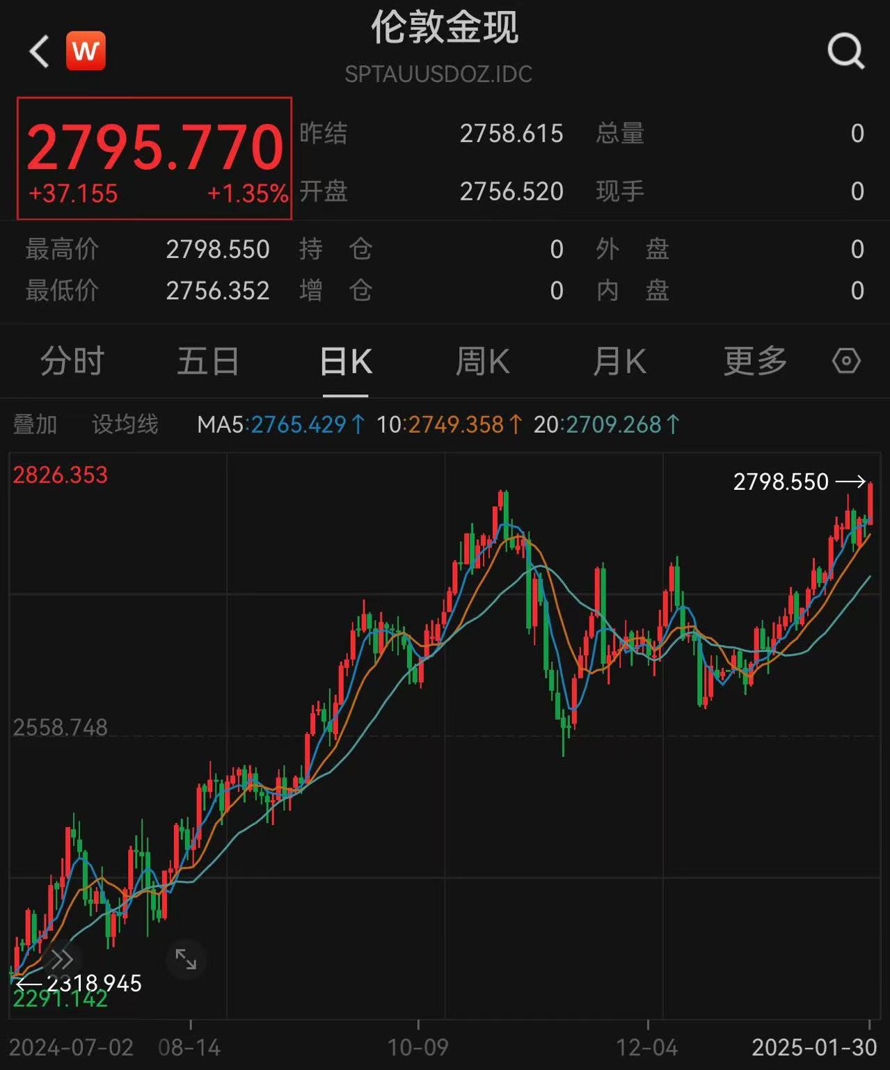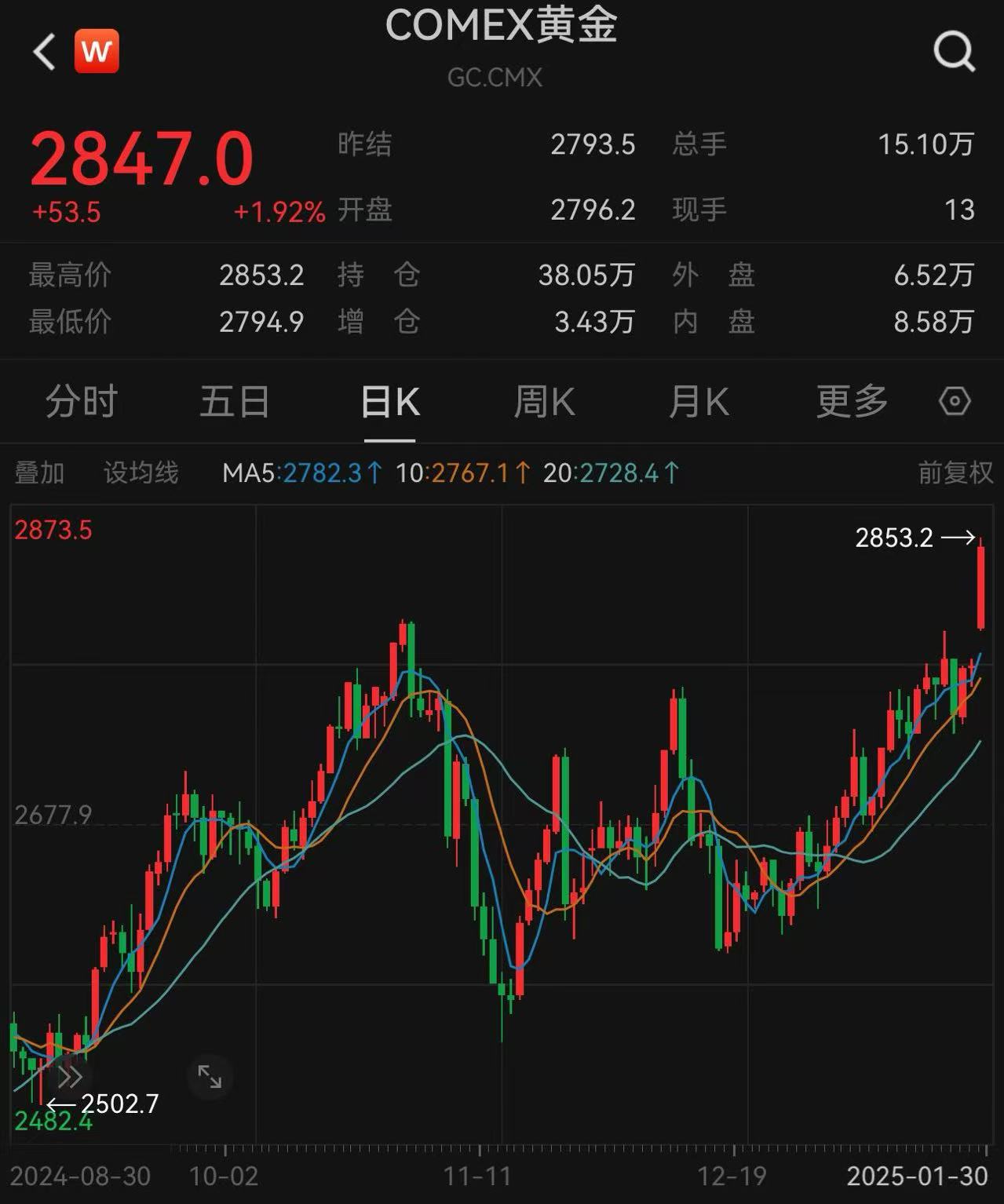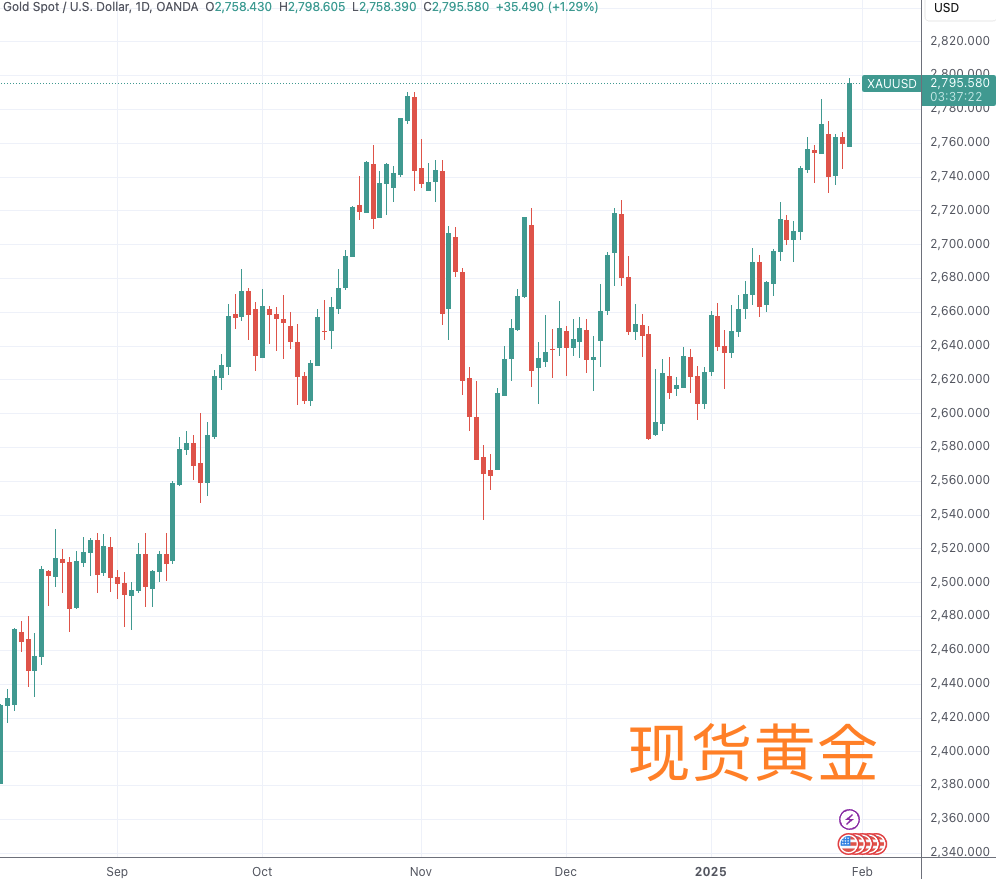 截至北京时间周五凌晨,现货黄金涨超1%,接近2800美元/盎司;纽约COMEX黄金涨超2%,日内一度冲上2850美元/盎司。两个标的均突破去年10月底的历史前高。