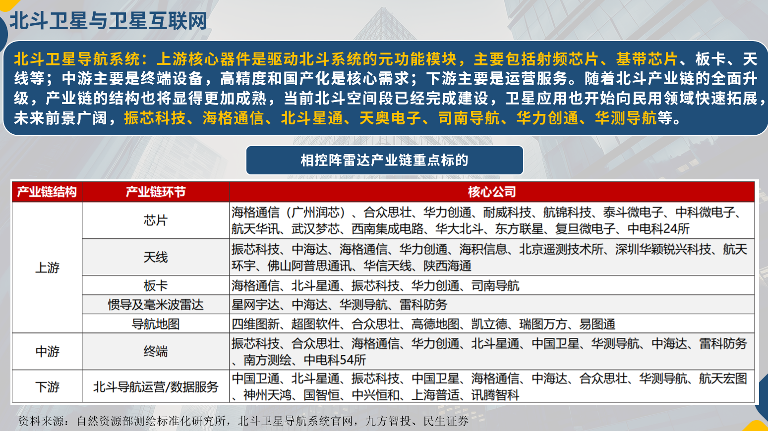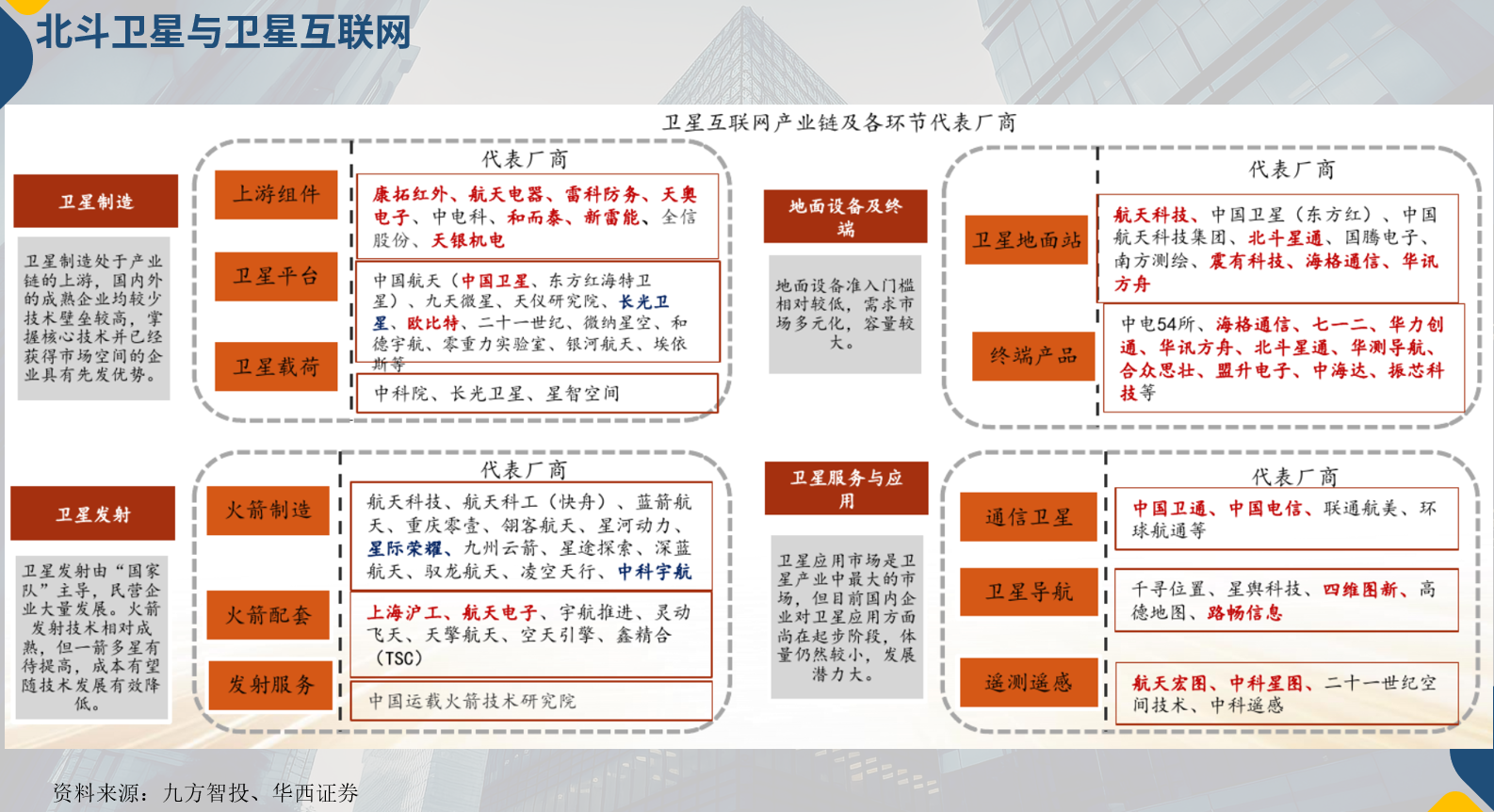 航天科技/科工:聚焦航天器与导弹系统,上游材料依赖中国电科,下游应用延伸至卫星通信。