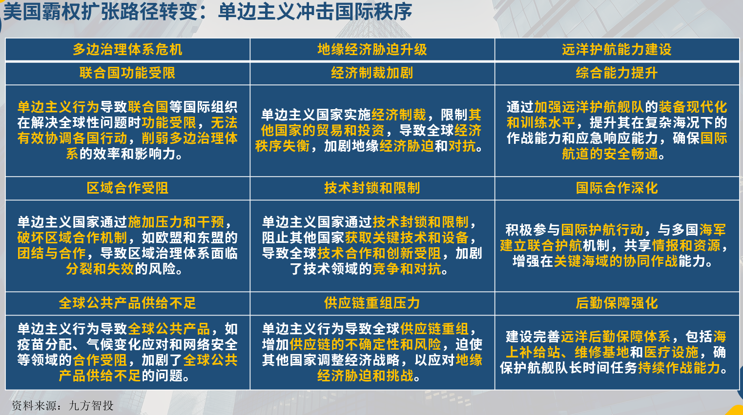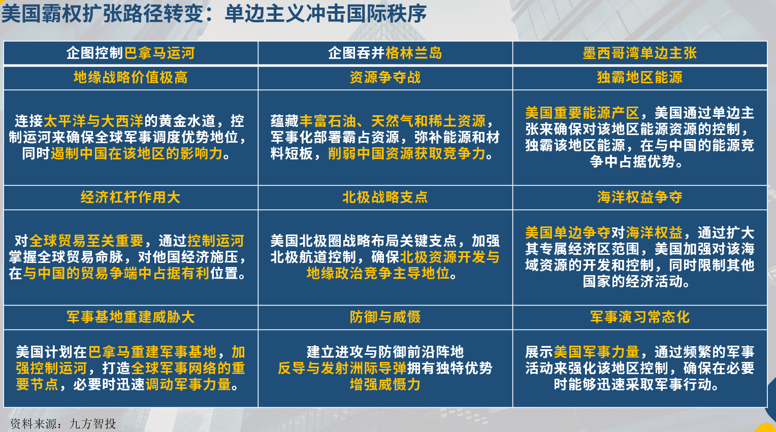 3.在百年未有之大变局下,军工行业作为国家安全与战略博弈的核心支柱,其作用愈发凸显。当前国际格局呈现三大特征:大国竞争白热化(美国将中国列为“唯一全面竞争对手”并征收145%关税)、地缘冲突复杂化(如美方试图通过军事手段介入巴拿马运河控制权,遭中方坚决反对),以及技术革命与军备竞赛交织(美国提出创纪录的1万亿美元国防预算,加速推进核武器、第六代战机及导弹防御系统等超级项目)。在此背景下,军工行业的后盾作用体现在以下维度: