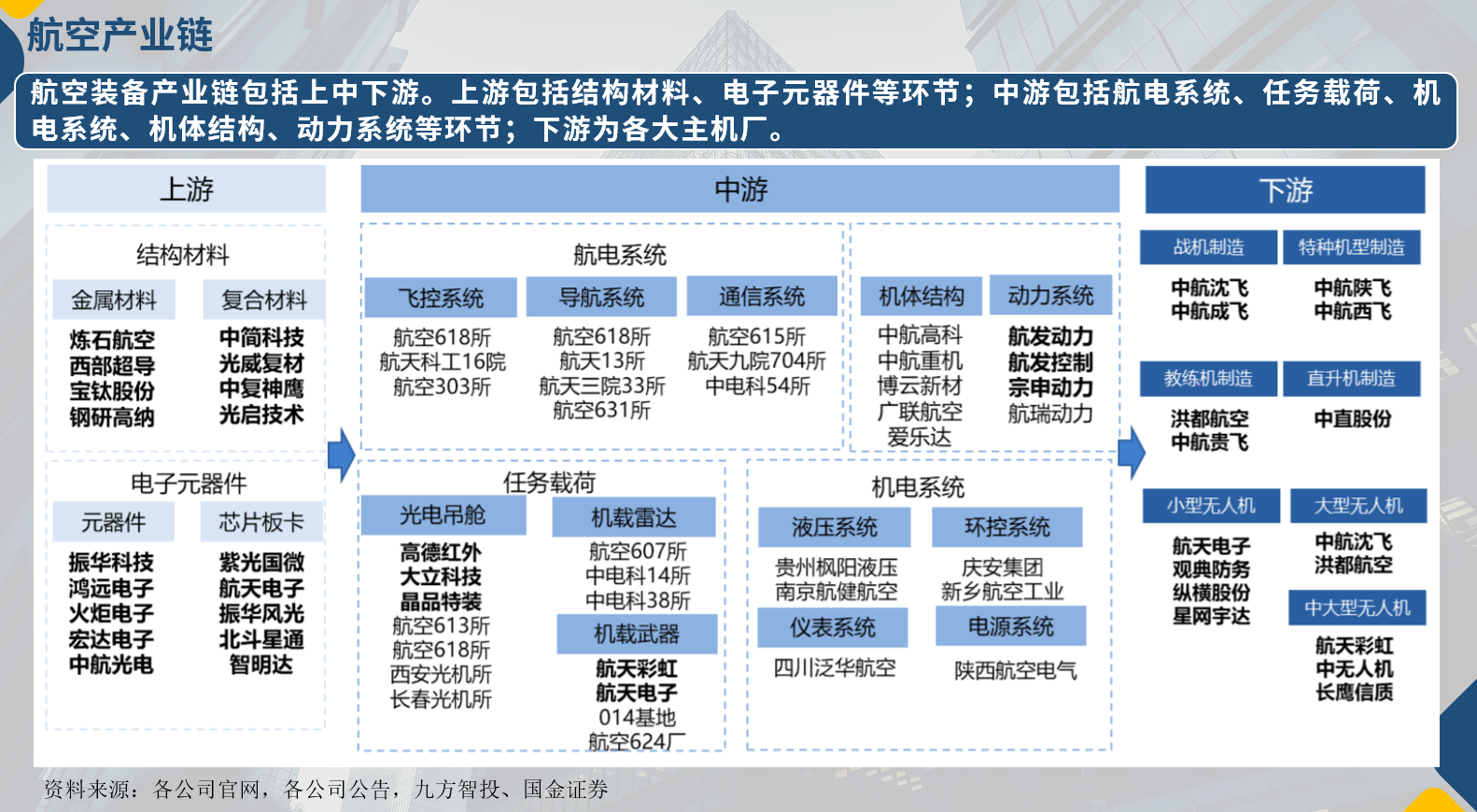 航空工业集团:覆盖军机全产业链,从复材(上游)到整机(下游)。