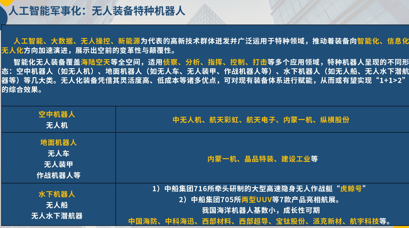 2.结合当前国际形势、技术突破及政策导向,军工行业正从传统装备制造向智能化、体系化方向转型,各细分领域呈现差异化增长态势。重点关注技术壁垒高、政策支持明确、出口潜力大的细分赛道,如卫星互联网、军工数据链、六代机产业链等领域。