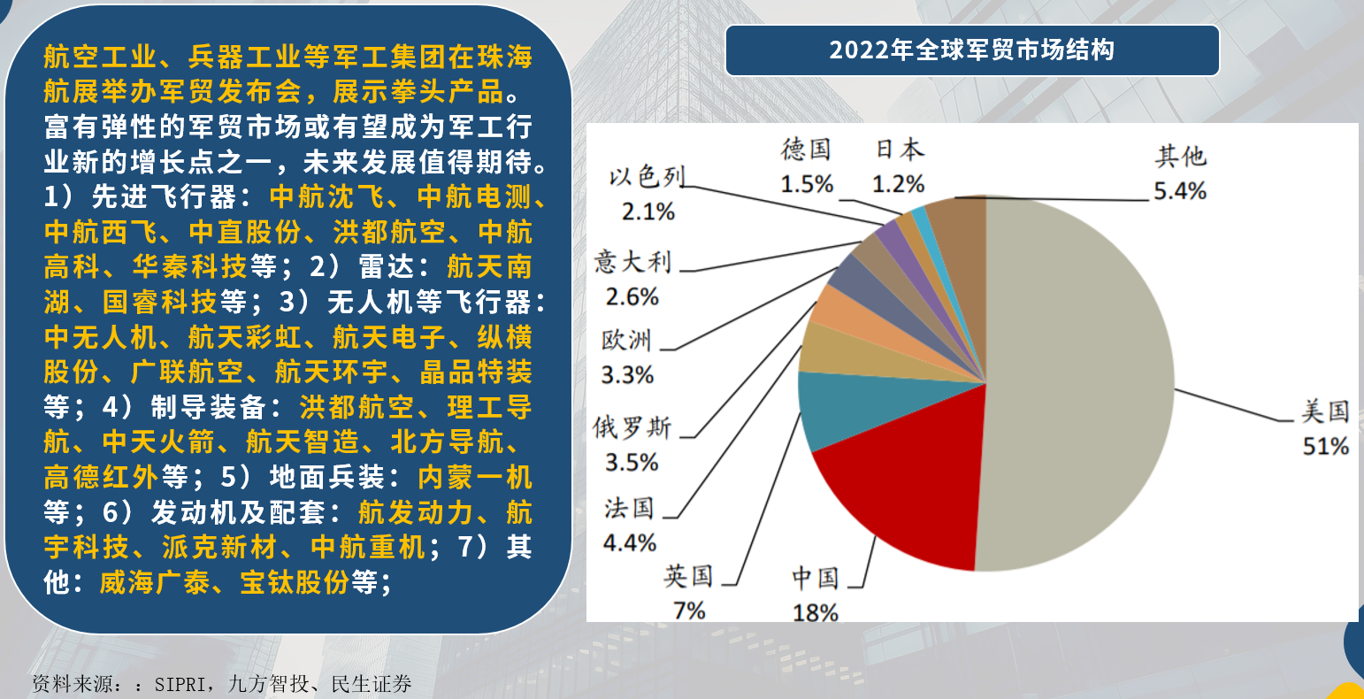 2)经济与科技双轮驱动:美国军费扩张刺激全球军备竞赛,2023年全球军贸市场规模达6320亿美元,中国以14.3%的市占率稳居第二,无人机出口占比超30%。军工技术外溢推动商业航天、低空经济等万亿级民用市场发展,形成“军民协同”增长极。