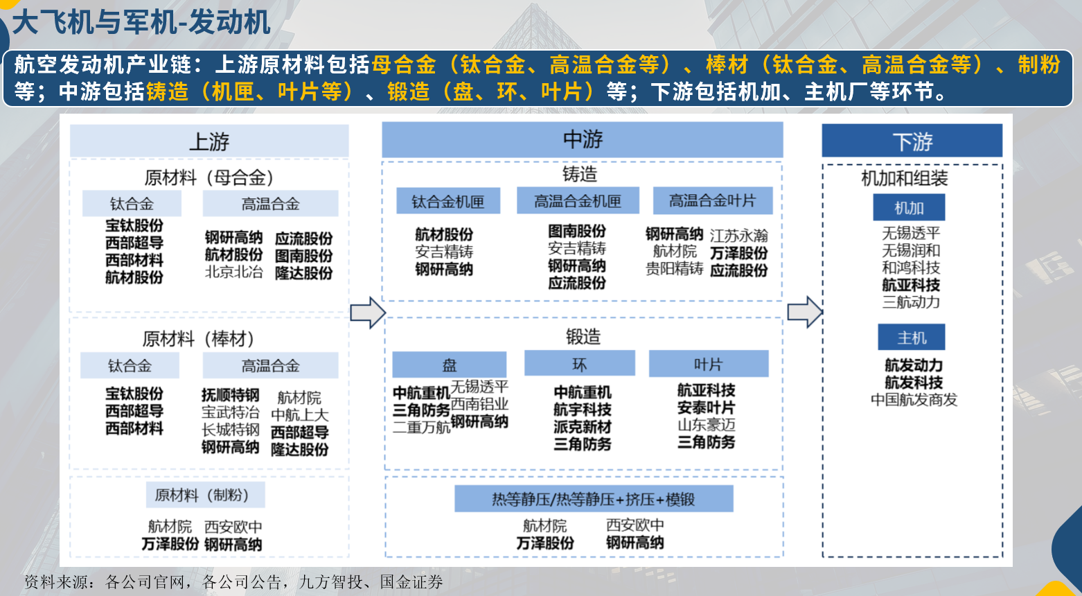 航空领域:中航工业(航电系统、发动机叶片),航发动力(涡扇发动机总成)。