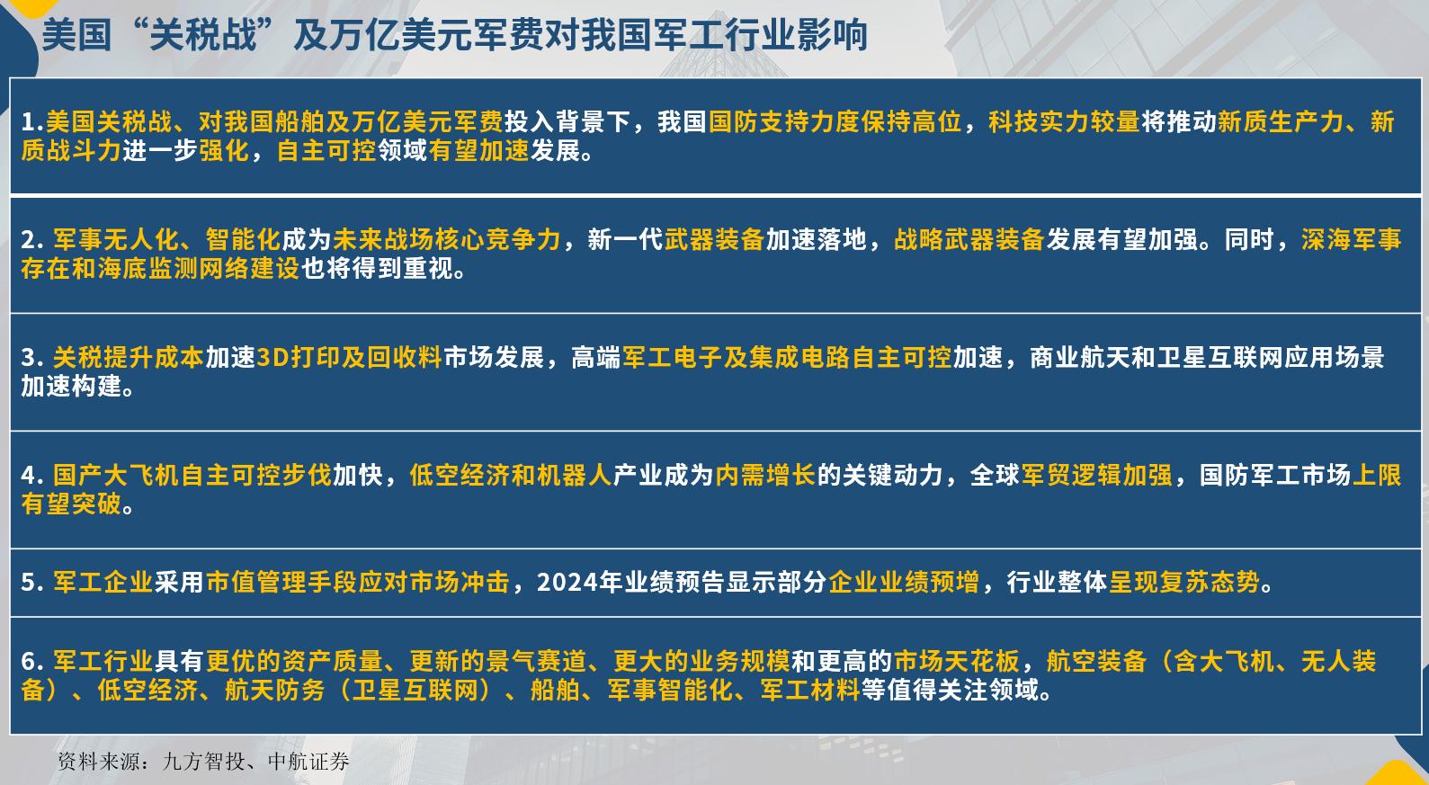 4)抗风险与战略自主:面对美国加征关税等外部冲击,军工产业链自主可控性强,需求刚性与内需占比高的特点使其具备较强抗波动能力,成为经济“安全垫”。