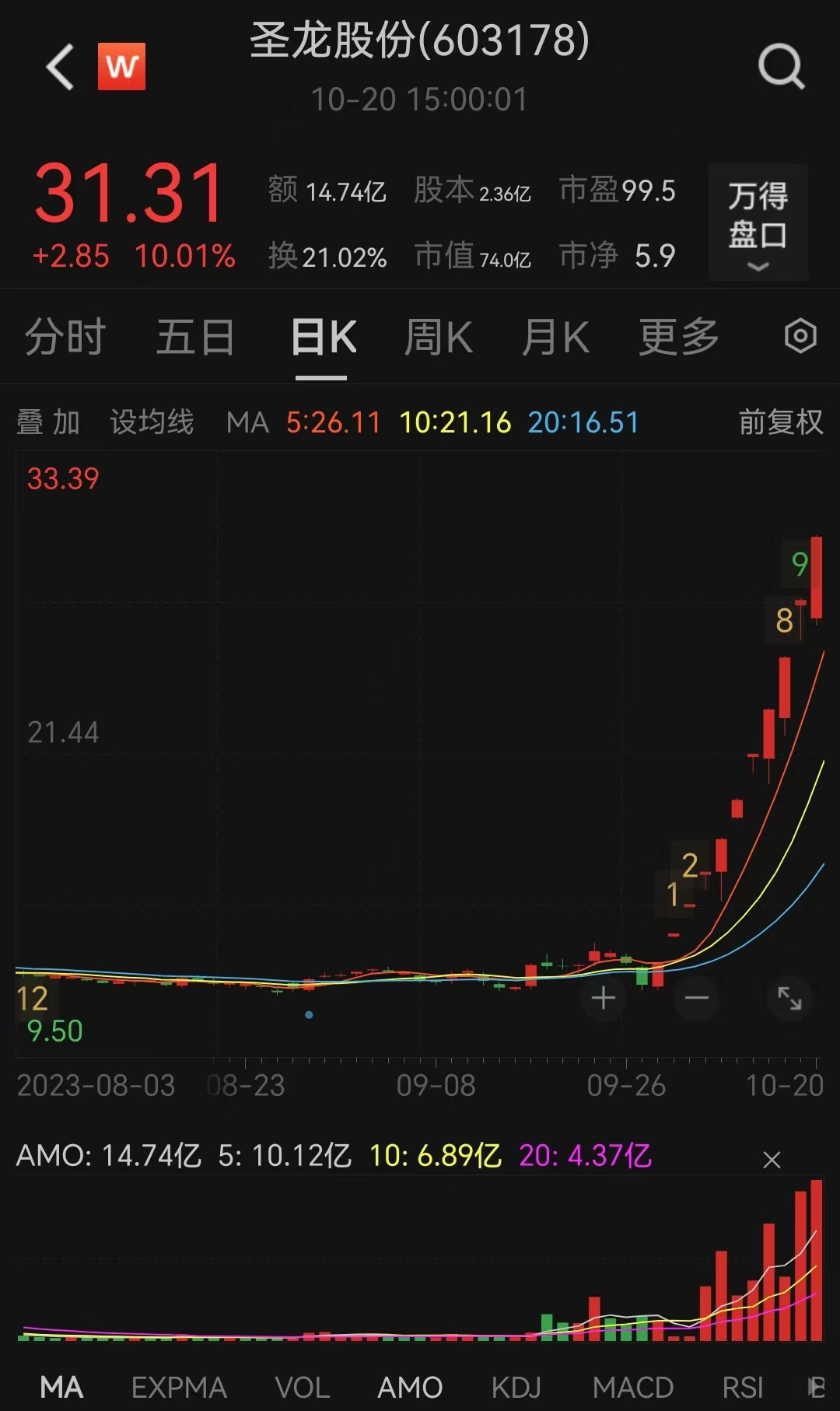 10月20日,圣龙股份尾盘再度强势涨停,收报31.31元/股,上涨10.01%,全天成交14.74亿元,创下历史新高。当天,公司股票换手率急剧放大,达到21.02%。