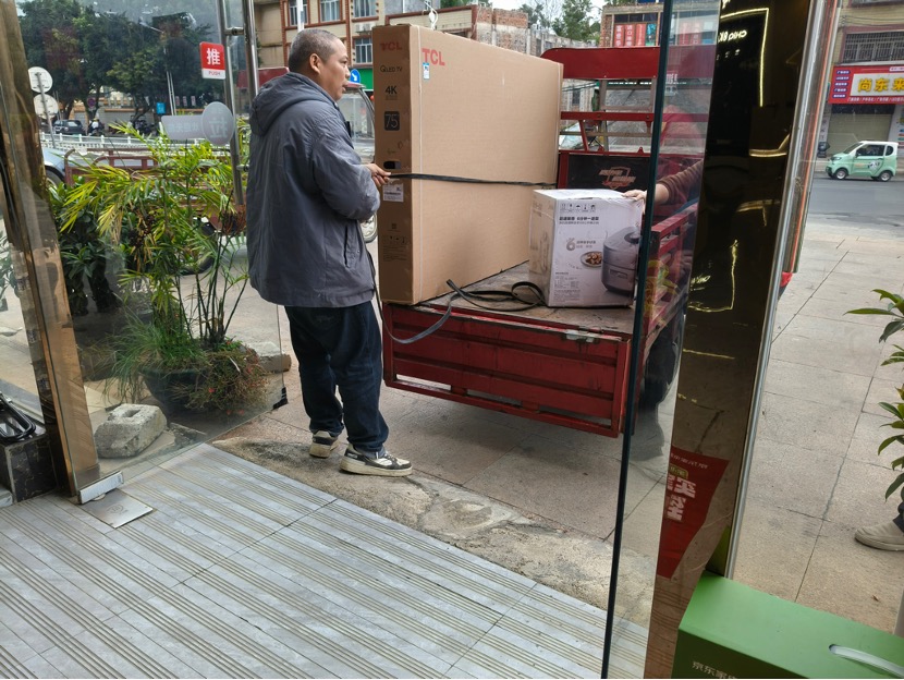 (工作人员将家电装车准备送货上门 财联社记者摄)