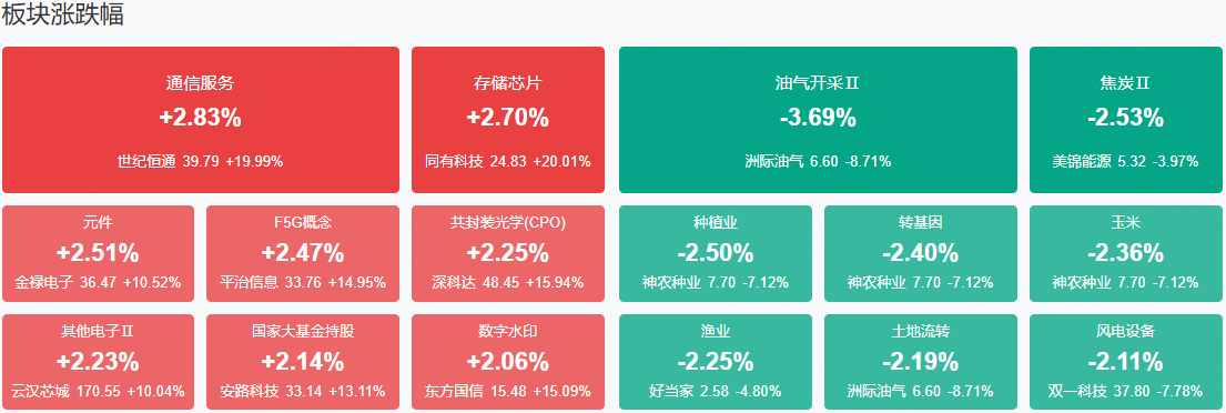 板块方面,算力硬件、液冷服务器、存储芯片、算电协同等板块表现活跃,油气、煤炭、农业等板块表现落后。截至收盘,沪指跌0.4%,深成指涨0.05%,创业板指涨0.89%。