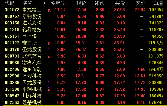 汽车产业链股今日逆市活跃,截至收盘,中捷精工涨超11%,浩物股份、腾龙股份、铭科精技、西上海、赛力斯、圣龙股份、北汽蓝谷、渤海汽车等涨停。