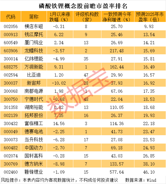 按照机构一致预测今年净利计算,磷酸铁锂概念板块估值普遍较低。其中,横店东磁前瞻市盈率不足10倍最低,钱江摩托、厦门钨业、龙蟠科技等11股市盈率不足20倍。部分个股也明显获得大资金青睐。比如湖南裕能、亿纬锂能、富临精工等个股去年三季度均获得多家机构新进。