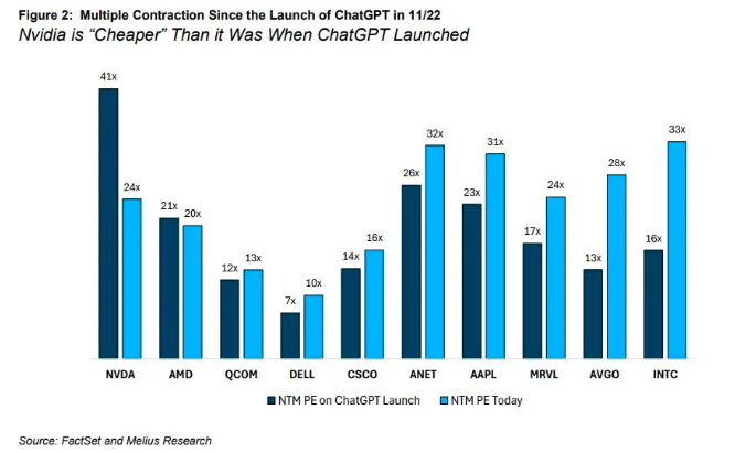 Melius Research董事总经理Ben Reitzes指出,即便采用华尔街更为青睐的对比未来一年盈利预期的远期市盈率指标来看,英伟达的估值收缩趋势依然成立。