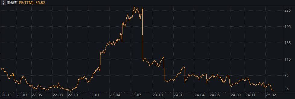 根据YCharts的数据显示,截至本周一,英伟达过去12个月的滚动市盈率(市盈率TTM)已降至了约36倍。这一下降主要源于英伟达股价的剧烈调整,该股周一收盘价已较1月初创下的盘中历史高点累计下跌了30%。