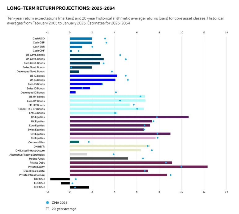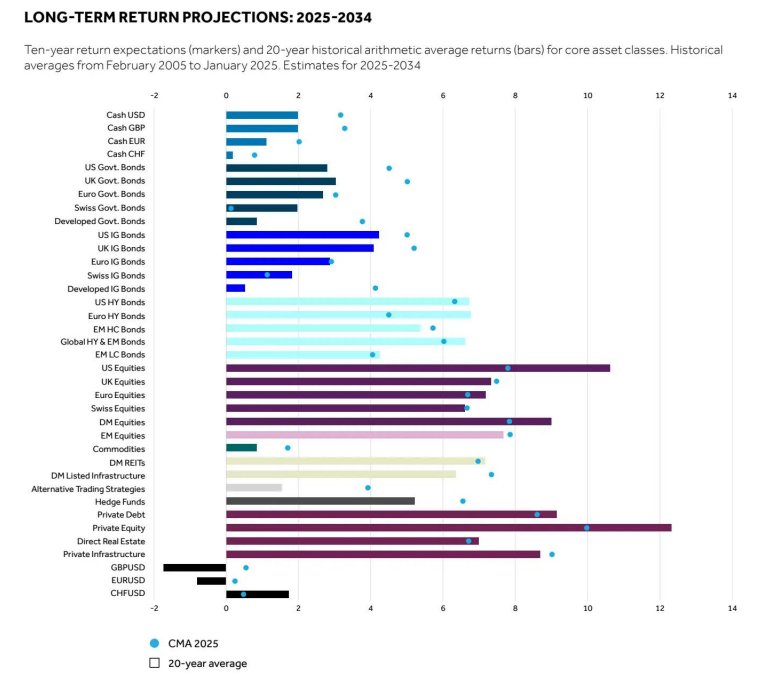 巴克莱瑞士苏黎世尼古拉・瓦西利耶维奇(全球资产配置主管)与卢卡斯・盖林格(量化宏观与主题策略主管)在一份研报中表示,全球主要经济体正沿着不同轨迹发展;政府债券的回报足以挤出许多其他投资,但并非所有流动性资产都是如此;股票仍是长期回报的核心;非流动性另类投资,尤其是对冲基金,往往能在这种环境中蓬勃发展。该行预计,未来十年欧元区政府债券和投资级债券的回报率约为5.0%,美国和英国债券的回报率在4.5% -5.2%之间。对高收益债券回报的预期仅比这高出1%-1.5%。