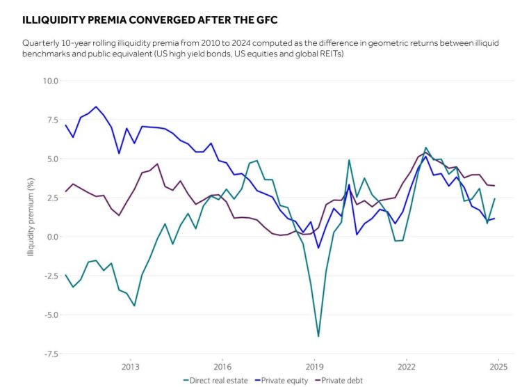 私募市场的回报在很大程度上追随其公开市场对标资产的表现,并带有非流动性溢价。该行估计,这种溢价处于 0.5% - 3.0% 的区间,直接房地产投资的溢价处于区间低端,而收购基金(最普遍的私募股权策略)的溢价处于区间高端。