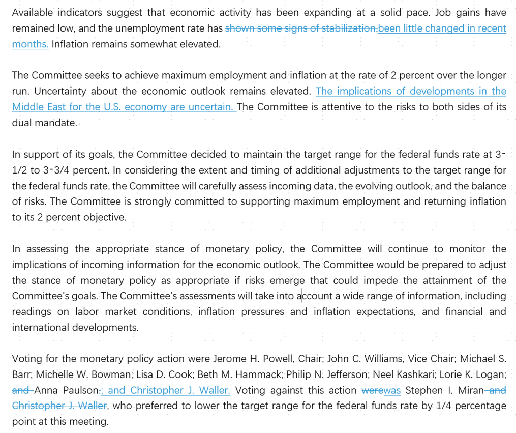 图表3:美联储货币政策声明对比(2026年3月vs 2026年1月)