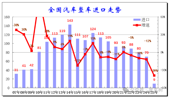 2025年1-3月进口汽车9.5万辆,同比下降39%,这是近期少见的1-3月巨大下滑。其中3月进口车3.9万辆,下滑27%,下滑稍有改善。