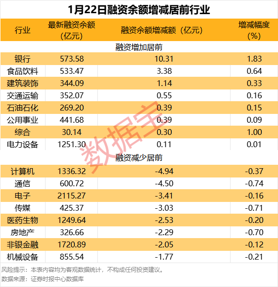 分行业统计,申万所属一级行业有8个行业融资余额增加,银行业融资余额增加最多,较上一日增加10.31亿元;融资余额增加居前的行业还有食品饮料、建筑装饰、交通运输等,融资余额分别增加3.38亿元、1.14亿元、5533.73万元;融资余额减少的行业有23个,计算机、通信、电子等行业融资余额减少较多,分别减少4.94亿元、4.50亿元、3.41亿元。