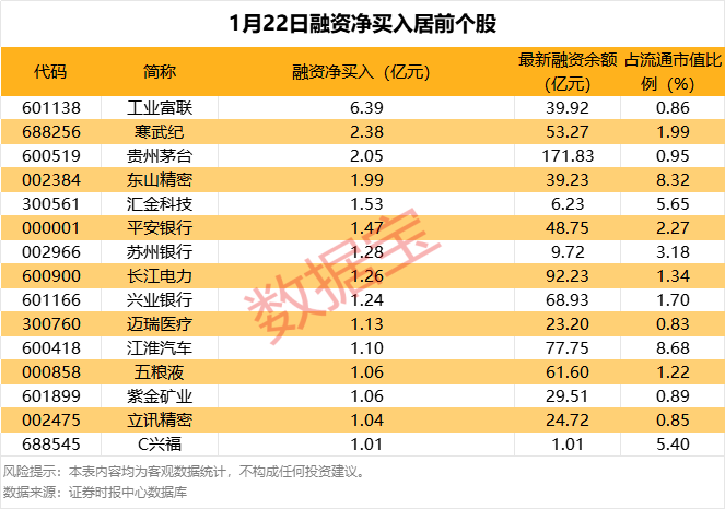 具体到个股,1月22日获融资净买入千万元以上的有251只,其中15只融资净买入额超亿元。工业富联融资净买入额居首,当日净买入6.39亿元;其次是寒武纪、贵州茅台,融资净买入金额分别为2.38亿元、2.05亿元;融资净买入金额居前的还有东山精密、汇金科技、平安银行等。