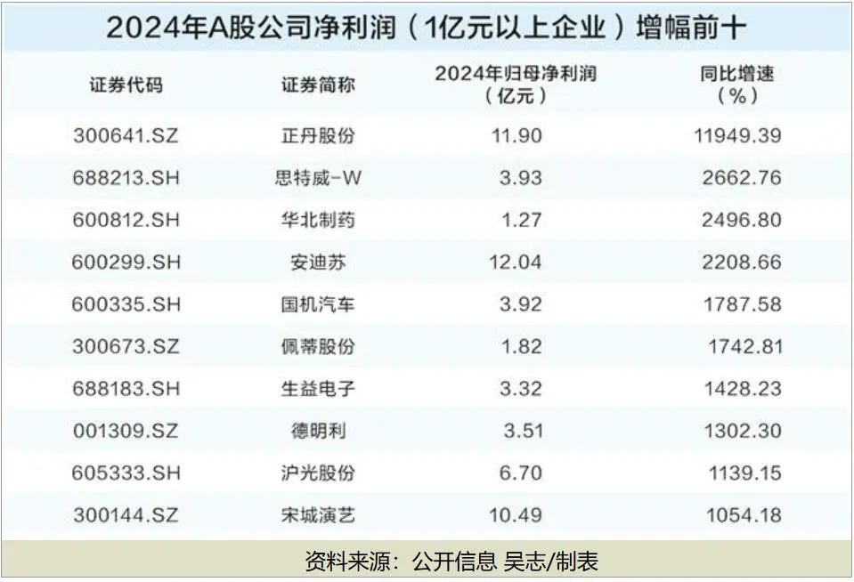 2024年,有近900家A股公司净利润同比增长超过50%,超过500家企业净利润增速超过100%。一批2023年大幅亏损的企业,也在去年实现盈利,如纳思达2023年亏损超过60亿元,2024年公司实现归母净利润7.5亿元。