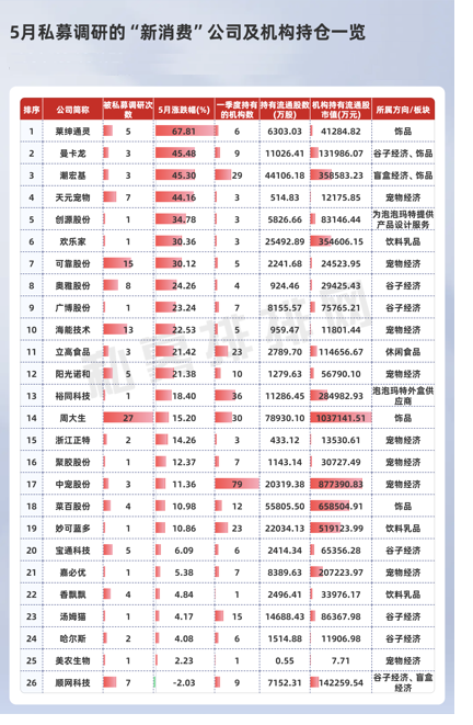 私募资本对新消费的关注早已超越单一企业层面,转向系统性赛道扫描。私募排排网数据显示,今年五月,私募机构累计调研494家A股上市公司,其中325家当月实现股价上涨。尤为值得注意的是,筛选出的26家新消费相关被调研企业中,25家在5月股价上扬,7家涨幅突破30%大关。