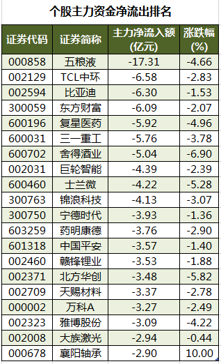 此外,3155只个股被主力资金净卖出,其中,109股被主力资金净卖出超1亿元。主力资金净流出最多的个股是五粮液,净流出金额为17.31亿元;主力资金净流出居前的个股还有TCL中环、比亚迪、东方财富、复星医药、三一重工,净流出金额分别为6.58亿元、6.3亿元、6.09亿元、5.92亿元、5.76亿元。