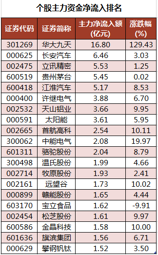 个股来看,今日有1575只个股获主力资金净流入,其中,37股获主力资金净流入超1亿元。华大九天获主力资金净流入最多,净流入金额为16.8亿元;主力资金净流入居前的个股还有长安汽车、立讯精密、贵州茅台、江淮汽车、许继电气,净流入金额分别为6.46亿元、5.53亿元、5.45亿元、5.17亿元、3.88亿元。