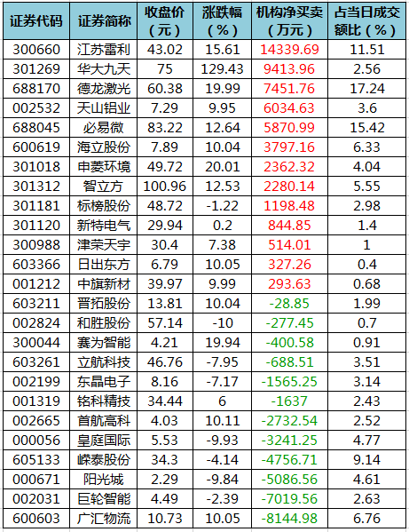 盘后龙虎榜数据显示,今日机构席位资金合计净买入约1.91亿元。其中,净买入的个股13只,净卖出的个股12只。机构净买入最多的股票是江苏雷利,净买入金额约1.43亿元;机构净买入居前的还有华大九天、德龙激光、天山铝业等股。机构净卖出最多的股票是广汇物流,净卖出金额约8144.98万元。机构净卖出靠前的还有巨轮智能、阳光城等股。