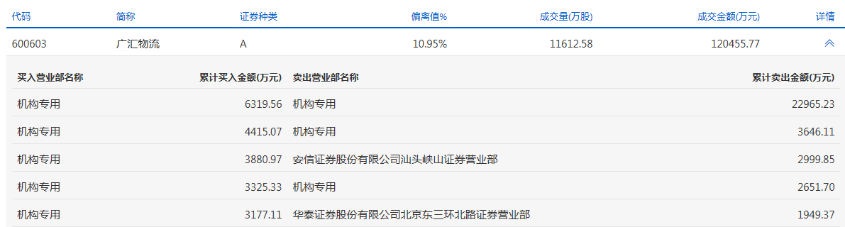 广汇物流今天涨停。盘后数据显示,8个机构出现在龙虎榜单上,合计净卖出8144.98万元;安信证券股份有限公司汕头峡山证券营业部卖出2999.85万元;华泰证券股份有限公司北京东三环北路证券营业部卖出1949.37万元。