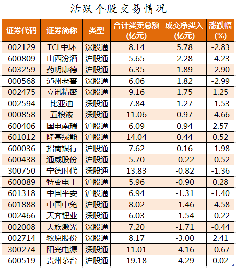 活跃个股方面,北向资金净买入较多的有TCL中环、山西汾酒、药明康德、泸州老窖、立讯精密,净买入金额分别为5.78亿元、2.28亿元、1.89亿元、1.82亿元、1.75亿元。北向资金净卖出较多的有贵州茅台、阳光电源、牧原股份、大族激光、天齐锂业,净卖出金额分别为4.29亿元、4.16亿元、3亿元、1.71亿元、1.54亿元。