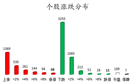 截至收盘,沪深两市合计1369只个股上涨,3255只个股下跌,平盘个股109只,停牌的个股7只。不含当日上市新股,共有68只个股涨停,15只个股跌停。连续涨停天数看,*ST奇信已连收10个涨停板,连续涨停板数量最多。