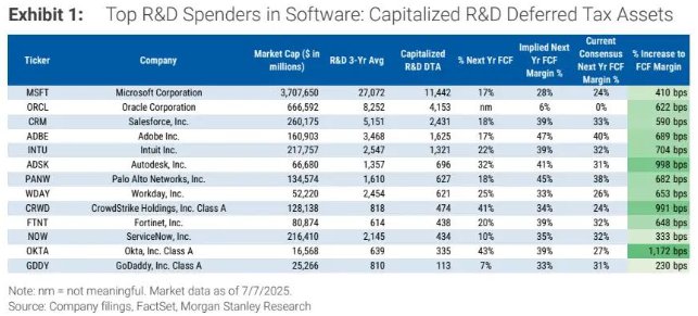 摩根士丹利近期发布研报称,上周通过的《大美丽法案》恢复了研发支出的即时扣除,这将为企业带来现金流助力。各公司可能很快会开始讨论这一现金流增长,而目前市场普遍预期中尚未纳入这一影响。该行认为,在整个软件行业中,Okta(OKTA.US)的自由现金流利润率受益最大,其次是Autodesk(ADSK.US)、CrowdStrike(CRWD.US)和财捷(INTU.US)。
