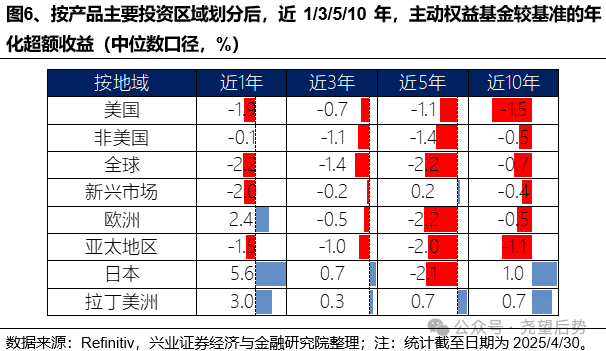 从长期的10年维度看,专注于投资日本(1.0%)的主动基金较基准的年化超额最高,其次为投资拉丁美洲(0.7%)和新兴市场(-0.4%)的主动权益基金,而主要投资于美国(-1.5%)、亚太地区(-1.1%)和全球(-0.7%)市场的主动基金明显跑输基准。