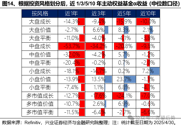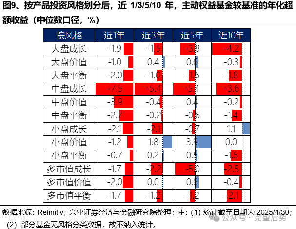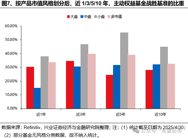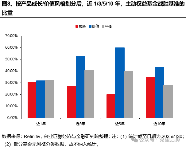 根据产品的投资风格来划分后,投资小盘和价值风格的主动基金更容易战胜基准。
