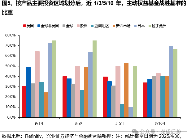 根据产品的主要投资区域来划分后,主要覆盖日本和拉丁美洲的主动权益基金战胜基准的胜率相对更高。无论是从中期的3年维度看,还是从长期的10年维度看,覆盖日本、拉丁美洲、欧洲和新兴市场的主动基金战胜基准的数量占比都明显高于主要投资美国、全球和全球非美国地区的产品。
