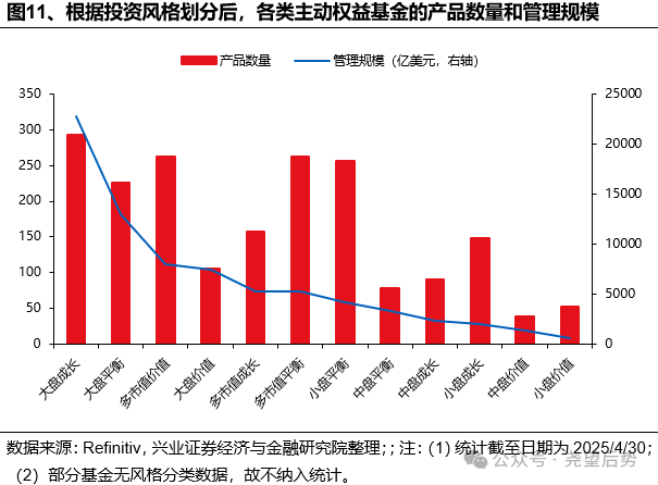 其背后的原因在于美国大部分主动基金以投资美国市场和大盘/成长风格为主,这又与过去十年全球市场的主线(美股科技长牛)重合度过高,因此相关类型的产品通过择时/行业轮动/选股难以贡献α收益,导致产品的收益空间和战胜基准的概率被压缩。