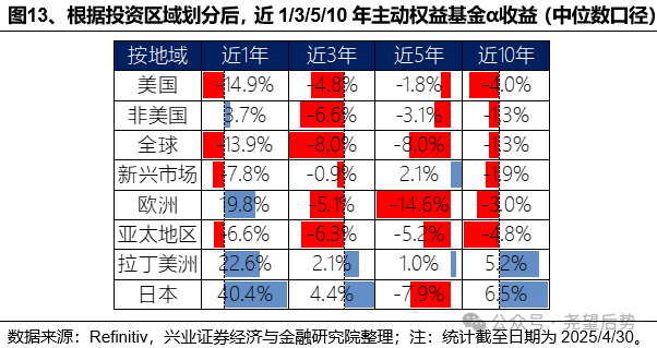 超额收益方面,投资日本和拉丁美洲的主动权益基金在中期和长期跑赢基准较多。从中期的3年维度看,投资拉丁美洲(0.3%)和日本(0.7%)的主动权益基金年化超额最高,而覆盖全球(-1.4%)和全球非美国地区(-1.1%)的产品则跑输较多。