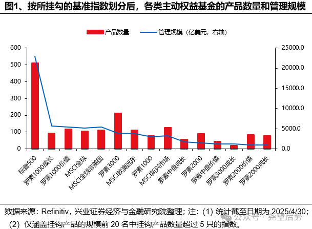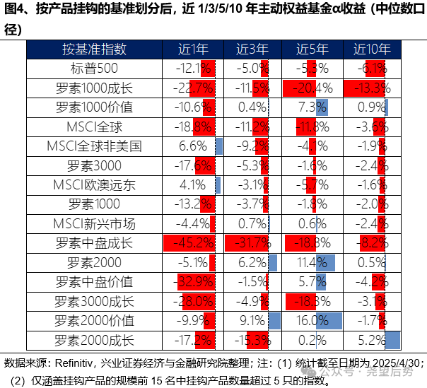 挂钩标普500和罗素1000成长等“热门”宽基指数的主动基金很难跑赢,反倒是以罗素2000和罗素2000价值等“小众“指数为基准的产品表现占优。截至2025/4/30,以标普500和罗素1000成长为基准的主动权益基金数量占比为18.49%、3.4%,管理规模占比为24.62%、6.14%,但这些产品在胜率、超额收益和α收益层面均不占优。与之相对的是,尽管以罗素2000和罗素2000价值为基准的主动基金规模占比仅为1.66%、1.08%,但其更容易跑赢,且超额收益和α显著。