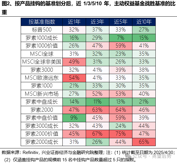 超额收益方面,从中期的3年维度看,以罗素2000价值(1.2%)、罗素2000(1.0%)和MSCI新兴市场(0.2%)为基准的主动基金超额收益较高,而挂钩罗素中盘成长(-5.7%)、MSCI全球(-2.3%)和罗素2000成长(-2.2%)的产品则明显跑输。从长期的10年维度看,挂钩罗素2000成长(1.0%)的主动基金较基准的年化超额最高,其次为以罗素2000价值(-0.1%)和罗素1000价值(-0.2%)为基准的产品,而以罗素1000成长(-8.0%)、罗素中盘成长(-3.1%)和标普500(-2.7%)为基准的产品则跑输较多。