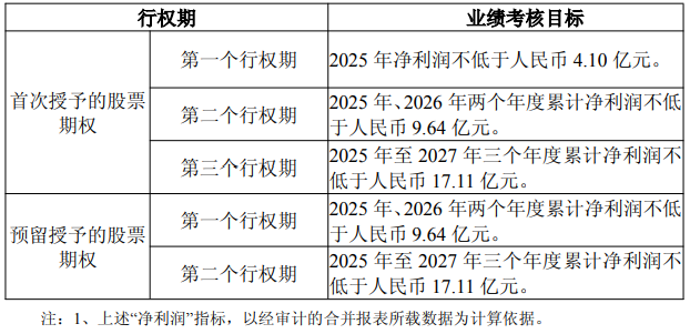 根据公司2025年股票期权激励计划,公司拟授予61人合计股票期权974.41万份,业绩考核为2025、2025-2026、2025-2027年净利润分别不低于4.10、9.64、17.11亿元。