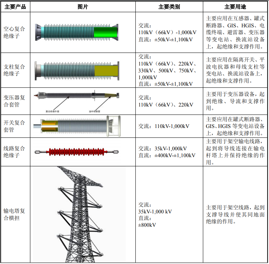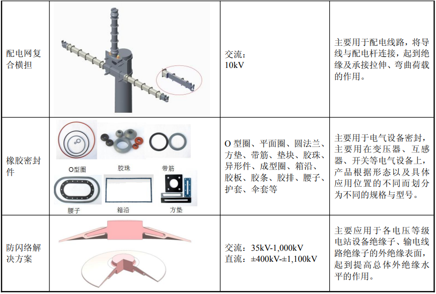 变电站复合外绝缘产品主要包括变电站复合绝缘子(空心复合绝缘子、支柱复合绝缘子)、变压器复合套管、开关复合套管等;输配电线路复合外绝缘产品主要包括线路复合绝缘子和复合横担(输电塔复合横担和配电网复合横担);同时,公司通过对电气设备密封结构、密封件材质和密封件安装工艺的深入研究,研发出电力设备用整体密封解决方案。此外,公司通过电气设计创新、结构创新和安装工艺创新,研发出防闪络解决方案,用于电力系统传统瓷、玻璃外绝缘产品的闪络事故治理。
