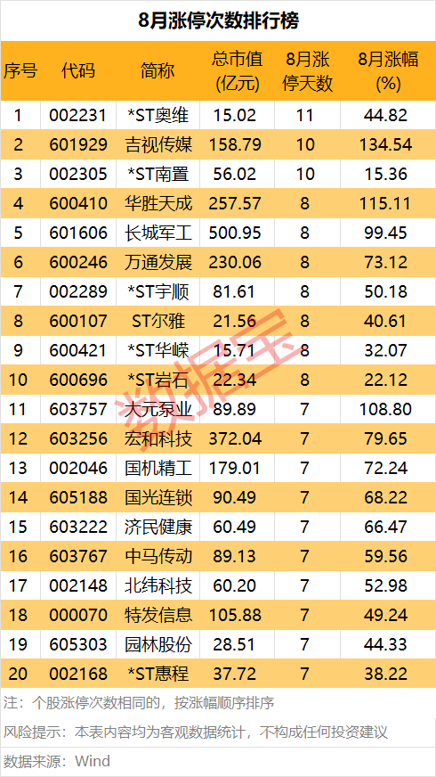 8月涨跌停次数排行榜出炉!超级牛股曝光(附名单)