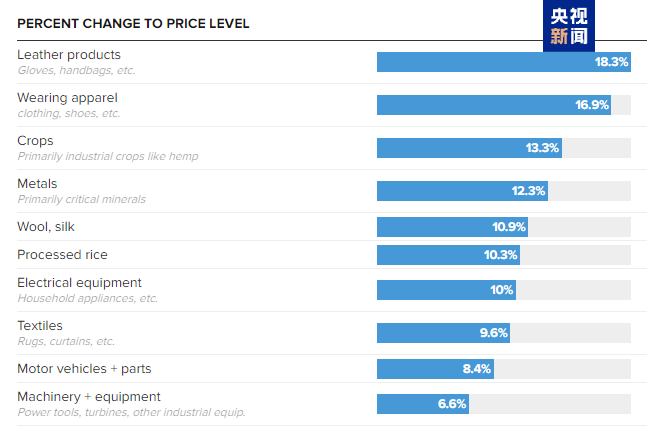 据耶鲁大学预算实验室预测,皮革制品、衣服、农作物、金属、羊毛等类别产品价格涨幅将超过10%。