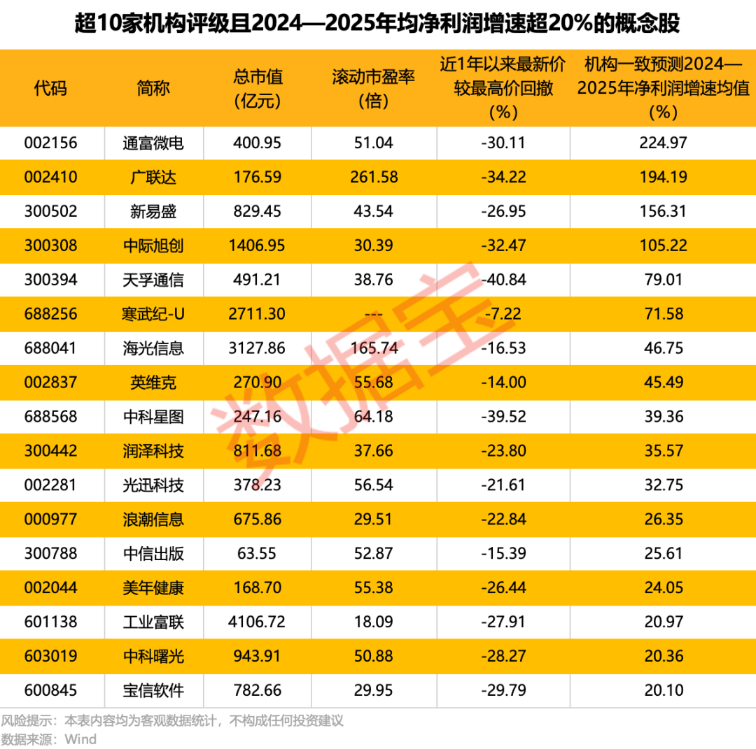 据数据宝统计,机构最新给予评级报告超过10家且一致性预测2024—2025年均净利润增速超过20%的概念股有17只,其中通富微电以224.97%的增速,排名第一;其次的广联达、新易盛、中际旭创年均增速也超过了100%。